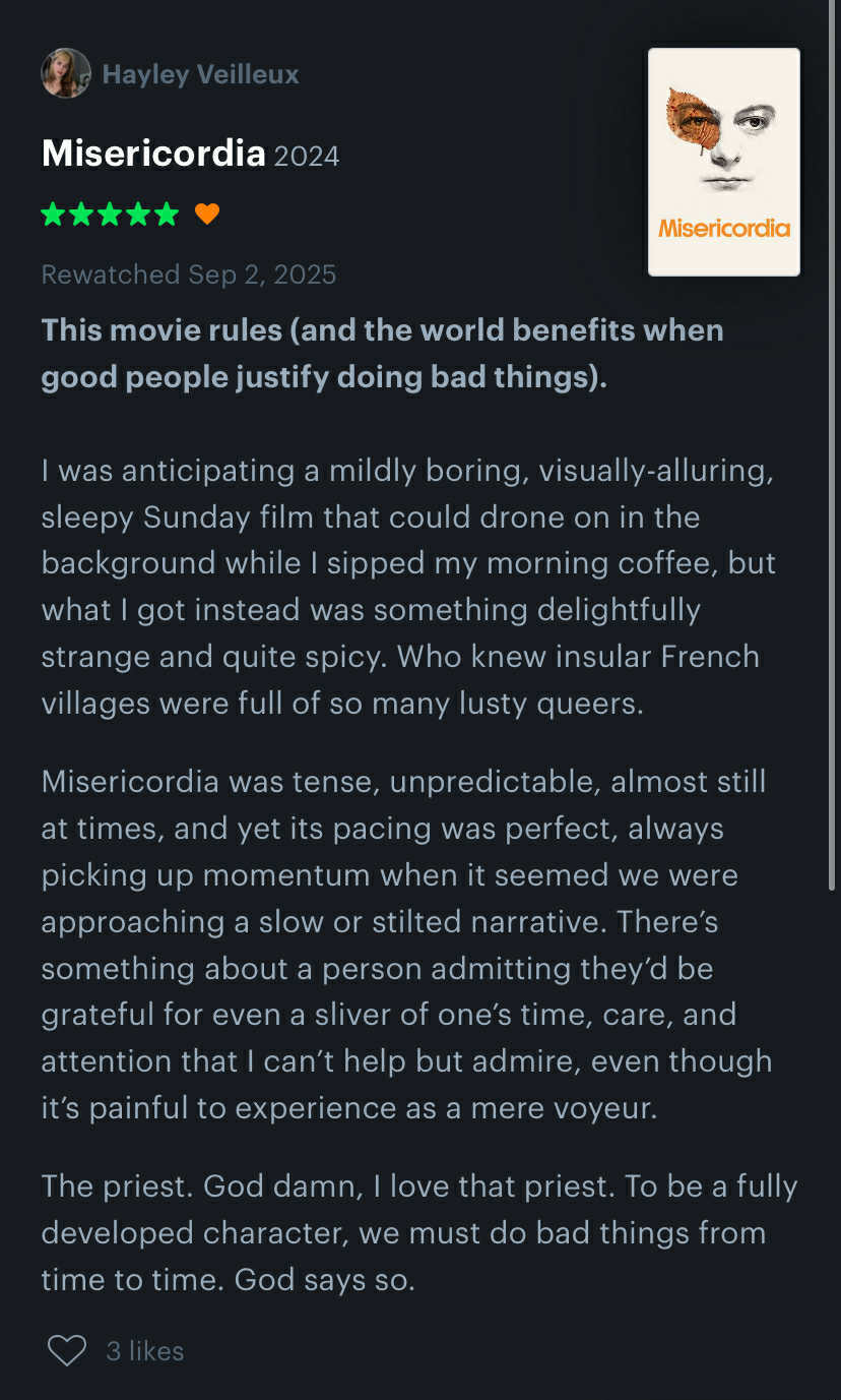 Movie: Misericordia | Below you will find an unstimulating Letterboxd review (No need to read it, hence it’s small) written by yours truly; however, it was written for Letterboxd, and therefore it isn’t actually a review but rather a long-winded way of saying I liked Misericordia, and “Misericordia” is a good word, and I think we all should have a heart for those in misery, today and always, and that mushrooms and absurdity and the existence of serene, rural French villages make life worth continuing—despite the despair of unrequited love and this corporeal plane’s surplus of tragedies and monotony... Despite it all.